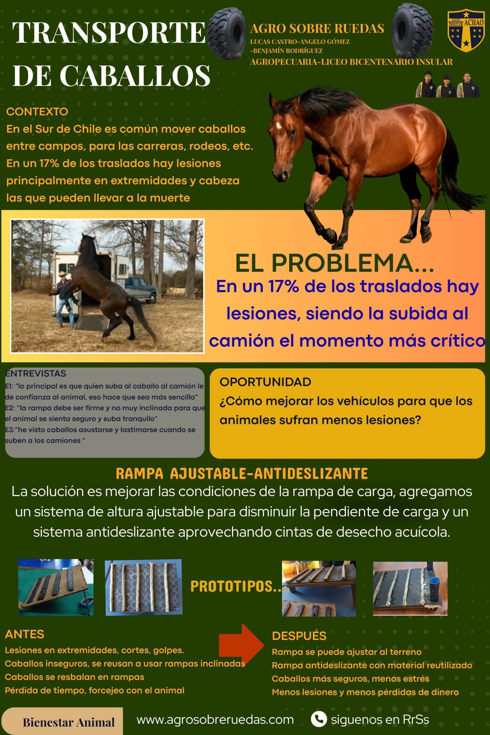 La idea de solución es una Rampa Ajustable, Antideslizante. En este caso, es Ajustable ya que la rampa es de altura ajustable con un sistema de seguros que permite cambiar la altura de cada una de sus esquinas. Además, considera un sistema de paredes laterales de armado modular y rápido que dé más seguridad al animal y con la característica de ser móvil a diferencia de las rampas de camiones que son fijas o simplemente no existen. La rampa es antideslizante ya que se instalará en el piso una goma de desecho de las cintas usadas en la industria de choritos, la cual es antideslizante, resistente y que de lo contrario es muy difícil de volver a reutilizar.