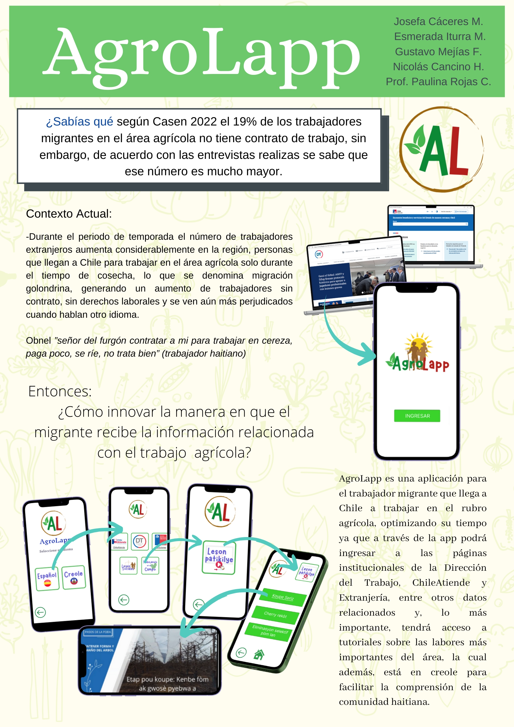 La idea de solución es una aplicación dirigida al trabajador migrante que llega a Chile para trabajar en el sector agrícola de la región, la cual tiene acceso a las páginas web de las instituciones gubernamentales que tienen directa relación con el trabajador extranjero, además, de tutoriales de las principales labores que se realizan en el campo de nuestra región. La app está en español y creolé por la gran población haitiana que ha llegado a Chile.