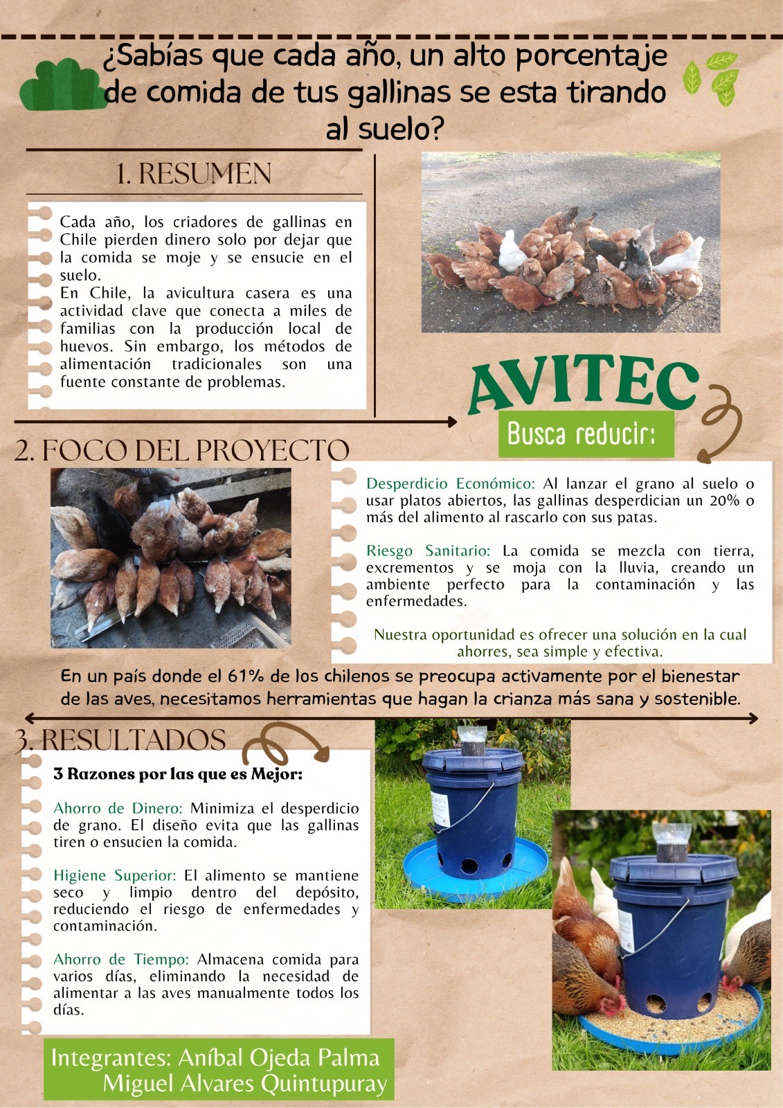 La creación de un comedero de gallinas para así no desperdiciar el alimento ni el dinero, para evitar las enfermedades producidas al tener la comida en el suelo.