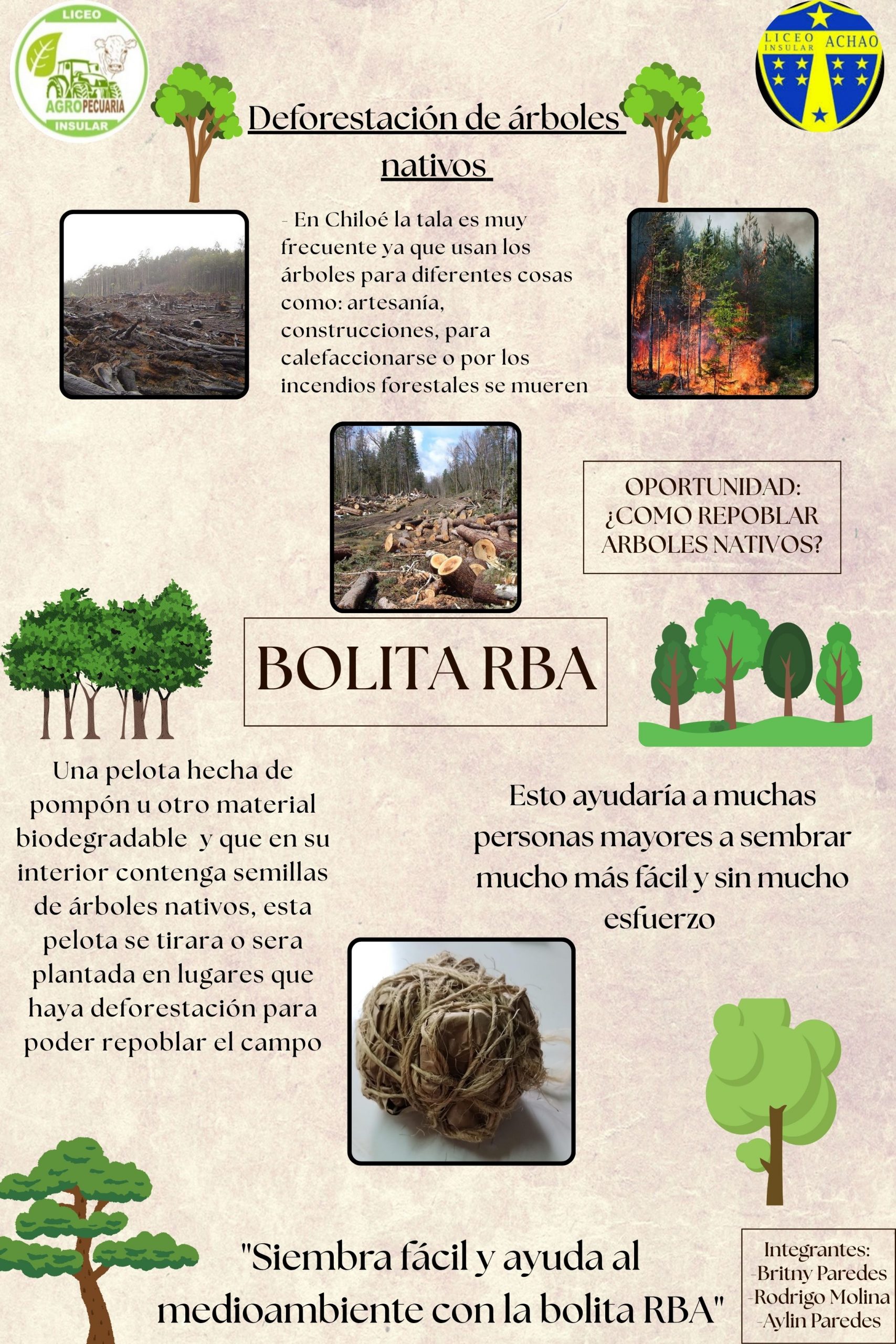 La solución que nosotros encontramos es realizar una pelota hecha de pompón u otro material biodegradable y que en su interior contenga semillas de árboles nativos. Esta pelota se tirará en los campos o será plantada en zonas sin árboles para repoblar.