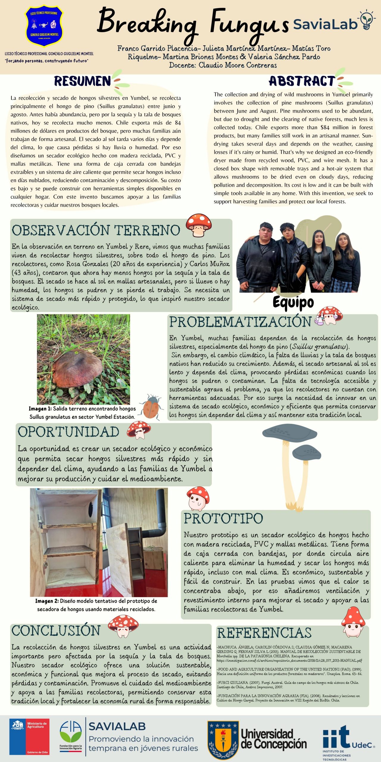 Consiste en la creación de un secador ecológico de hongos silvestres centrada en el hongo de pino (Suillus granulatus) siendo la cepa más recolectada en los bosques de pino en Yumbel. Crece durante los meses de invierno, siendo su secado un poco complicado por las lluvias, humedad, falta de lugares adecuados para protegerlo y además siendo muy lento su secado.
