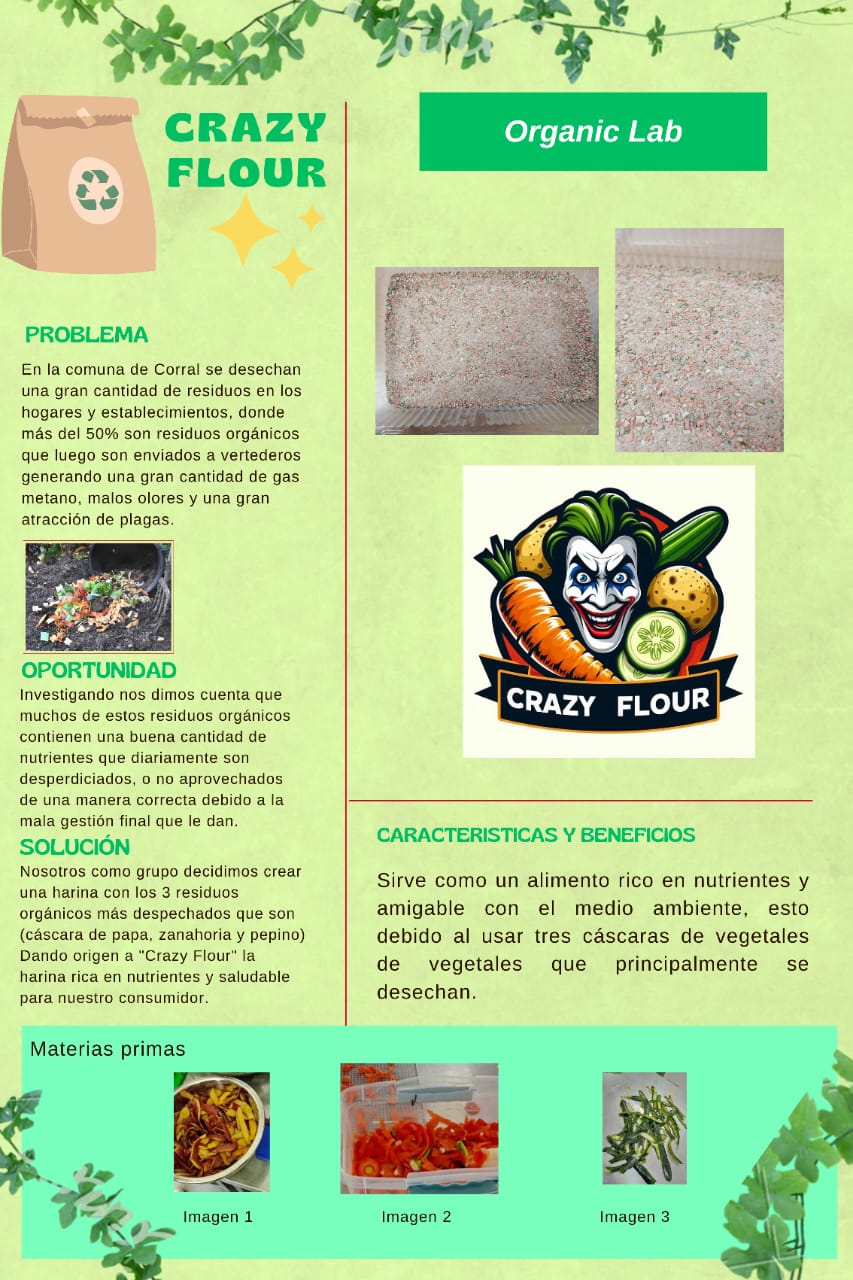 Pensando en una solución amigable con el medio ambiente y alta en nutrientes necesarios para el ser humano, nace “Crazy flour” la harina fabricada en base a cascaras de vegetales deshidratados con la cual se podrá elaborar productos de alta calidad y espléndido sabor para adultos y niños.