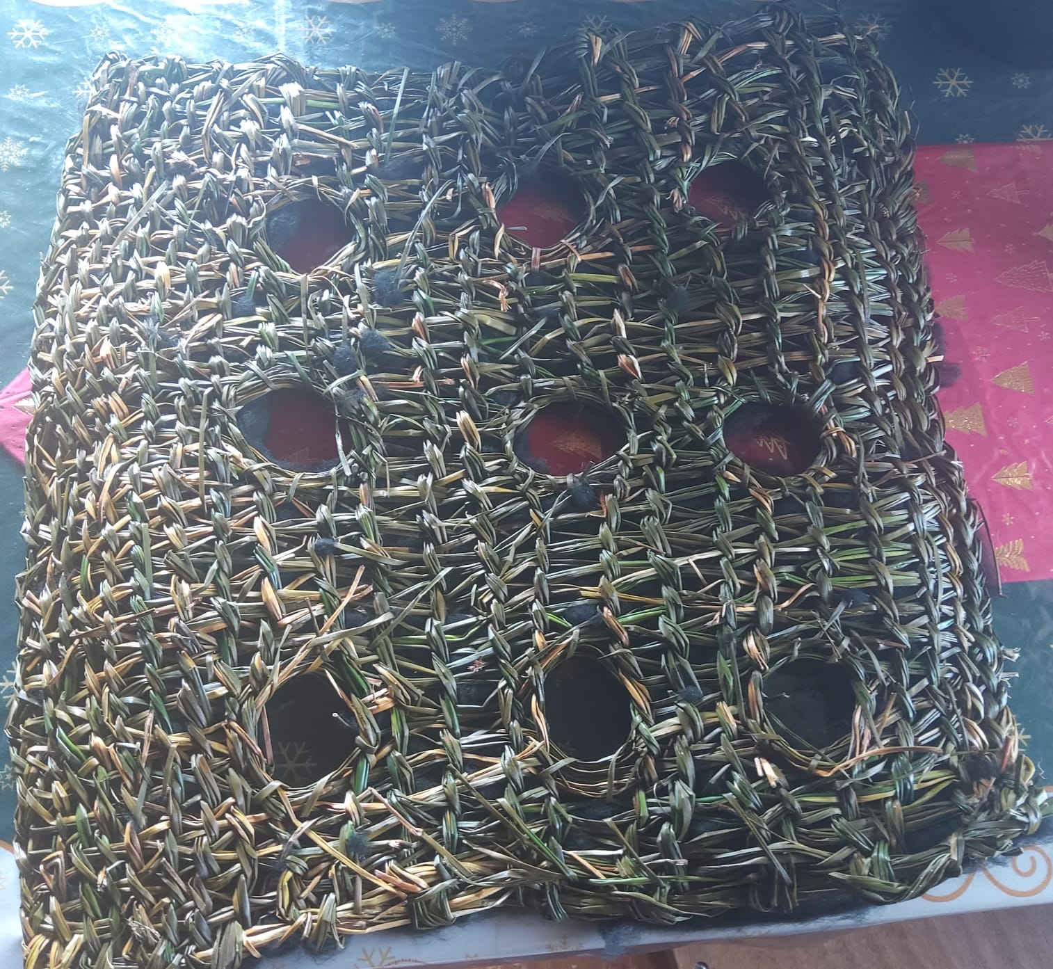 Probamos el prototipo $1$ que era de junquillo y nos dijeron que usáramos manila, ya que con cada hoja salen muchas fibras de manila. Hay que hacer la manila más gruesa para que cubra más la luz solar.
