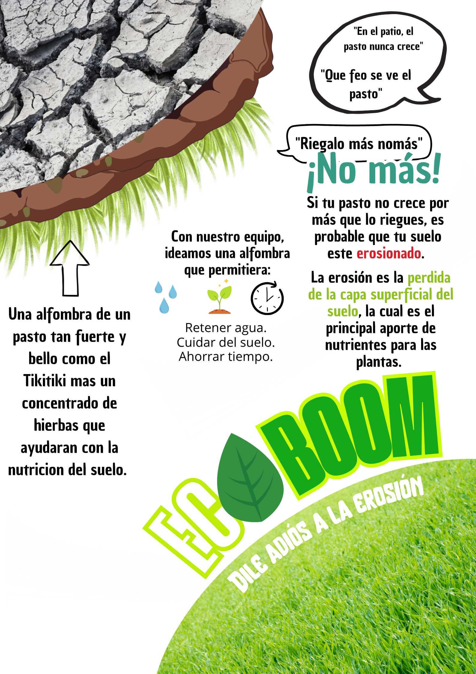 La solución es una alfombra orgánica de Tiki-tiki, la cual es una planta nativa, de muy bajo requerimiento hídrico, que serviría para generar un mulch orgánico, que retendría humedad, disminuiría la evaporación y evitaría la erosión. Esta alfombra tiene la característica de ser móvil, con lo que se puede cambiar de lugar, logrando los beneficios en diferentes suelos.