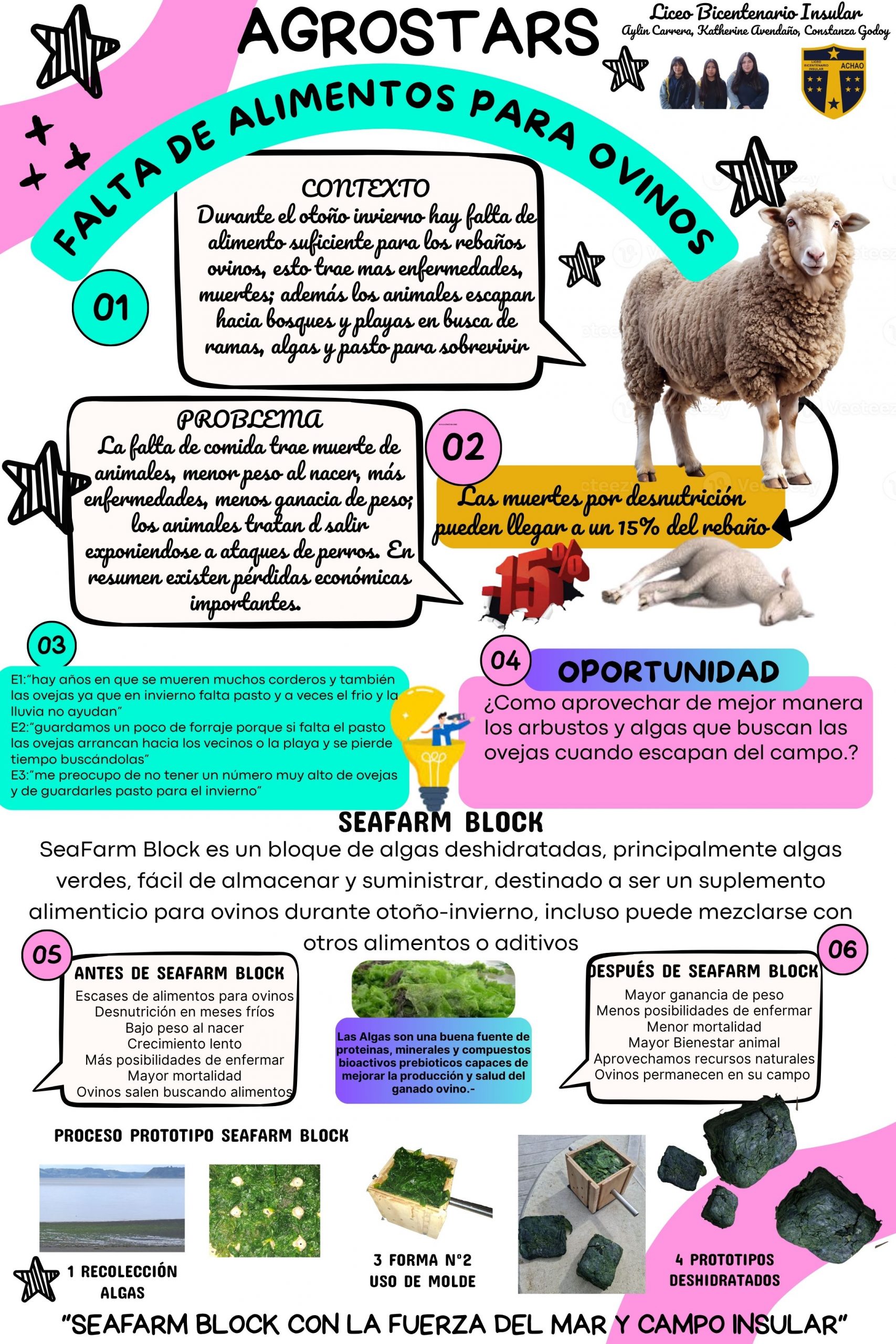 La idea de solución consiste en elaborar un Bloque hecho a partir de Algas Verdes para ser utilizado como suplemento alimenticio en ovinos, lo llamamos SeaFarm Block. Este bloque se confecciona con algas prensadas en un molde y deshidratadas. Al bloque se le deja un espacio al centro para poder ser fijado en los comederos de las ovejas. El bloque por su forma y al estar seco se puede almacenar fácilmente, además permite aprovechar la abundancia de algas verdes que hay en las playas de Chiloé durante varios meses del año, principalmente verano, lo que incluso facilita el secado. El Bloque puede ser mezclado con aditivos que permitan incorporar nutrientes al alimento o incluso saborizarlo. Lo anterior nace de la observación de que las ovejas consumen algas en las playas y al investigar encontramos que es una práctica que se ve en otros lugares del mundo y que no se ha aprovechado.