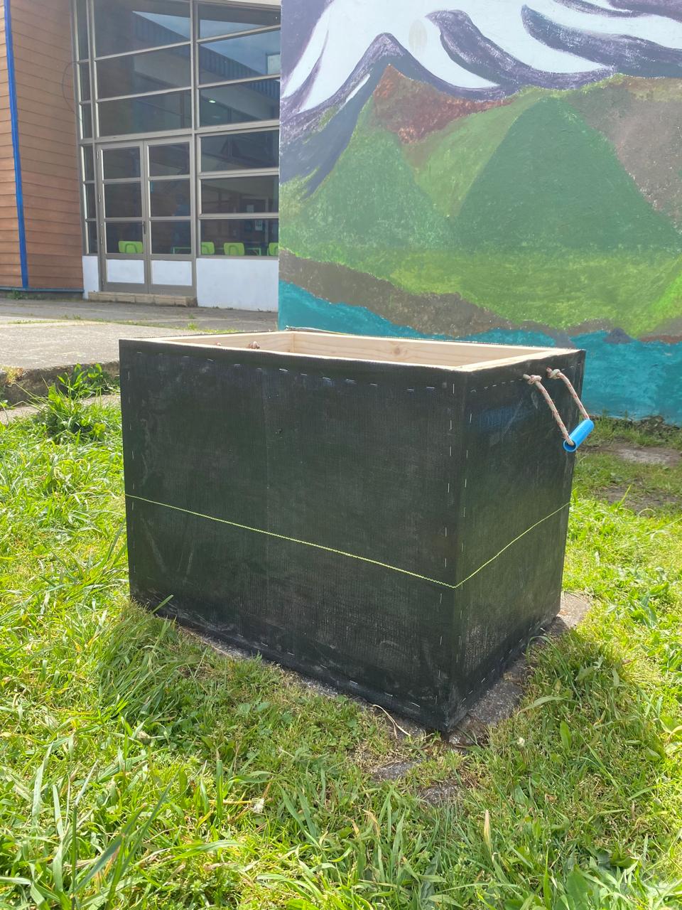 El prototipo de FungiLive fue elaborado con materiales como despuntes de madera y malla antimaleza, materiales de segunda mano disponibles en el área técnica de nuestro colegio. Cumple con características de materialidad y funcionales para mantener las condiciones adecuadas de temperatura, sombra, humedad y ventilación para favorecer la propagación y crecimiento del hongo ostra negro.