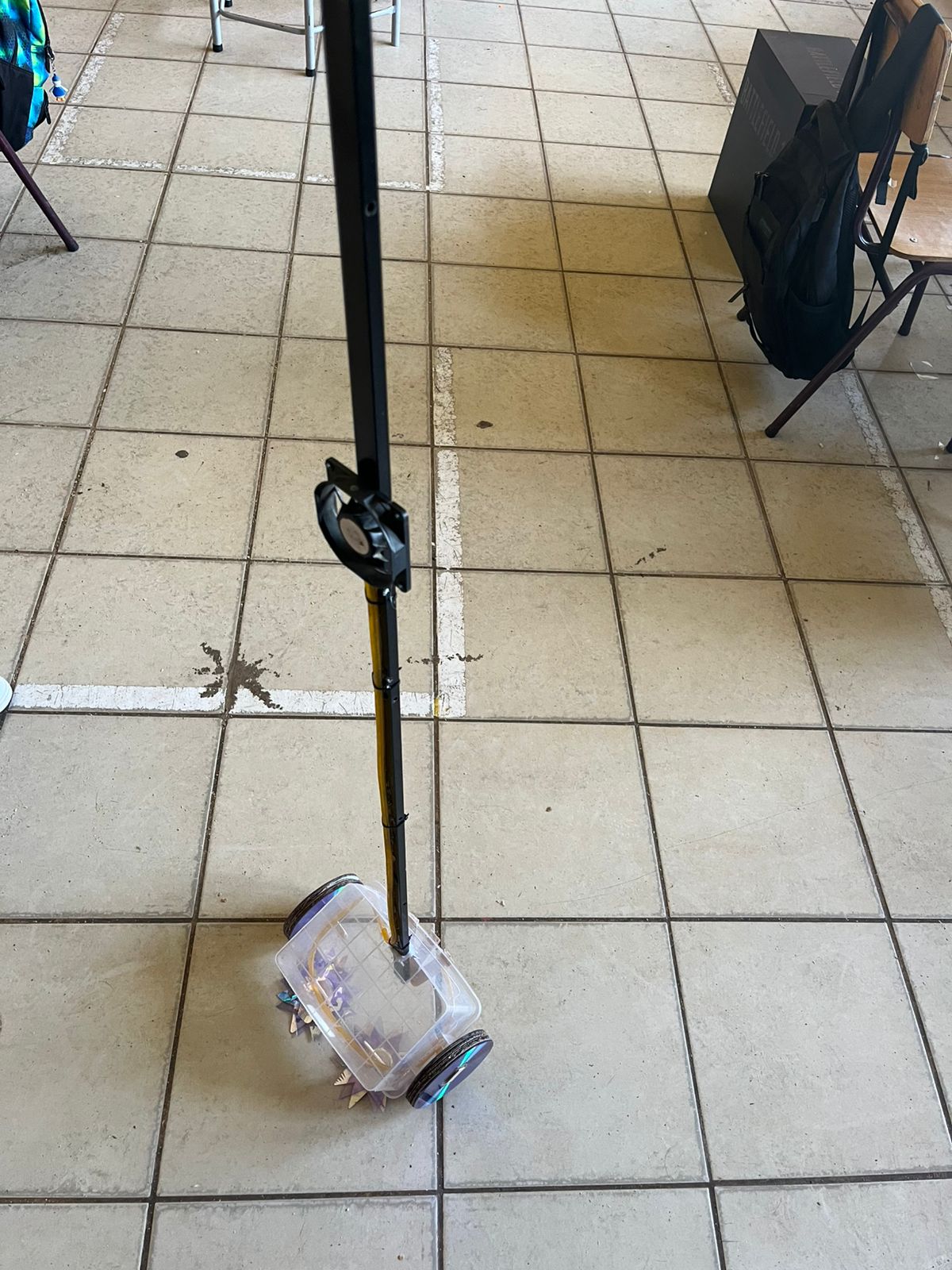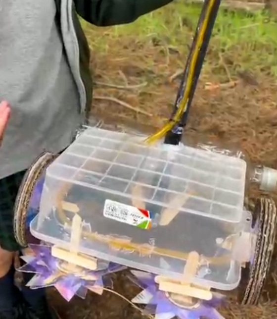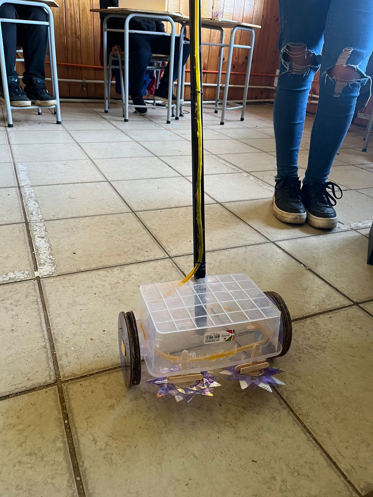 Hicimos una prueba segura, sin fuego real. En suelo seco logramos un surco discontinuo de 30 cm de ancho. Nuestro compañero probó distintas formas de azadón, unas acumulaban mucha tierra, hasta que la mejor fue una dientada. A través, de la observación nos dimos debiamos cambiar el modo en que nuestro prototipo cortaba la maleza, al principio era en forma de cortadora de pasto, esas que son metálicas, pero al observar a un tío de nuestro colegio que cortaba pasto, el nos dijo que era mejor una que fuese con navajas y que cortara en forma horizontal la paja. En cuanto al tambor, decidimos hacerlo porque, nos llamó la atención qué era lo que tenían los aviones al lanzar agua, ya que era de color rojo. De esta forma le incluimos un tambor con retardante.