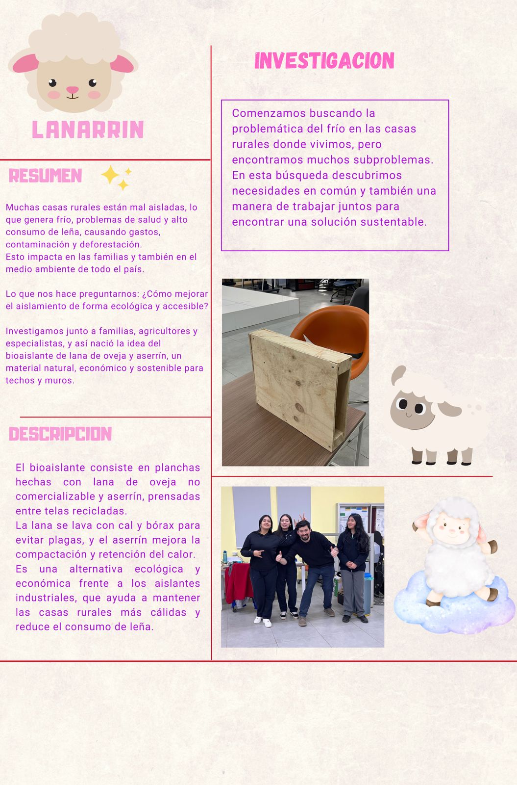 Vimos que en el campo se bota lana que no se vende y aserrín de aserraderos. Pensamos ¿Y si esos desechos sirven para abrigar las casas? Así nació la idea de un bioaislante con lana lavada y aserrín prensados en telas recicladas. Es económico, reutiliza desechos y reduce el uso de la leña.