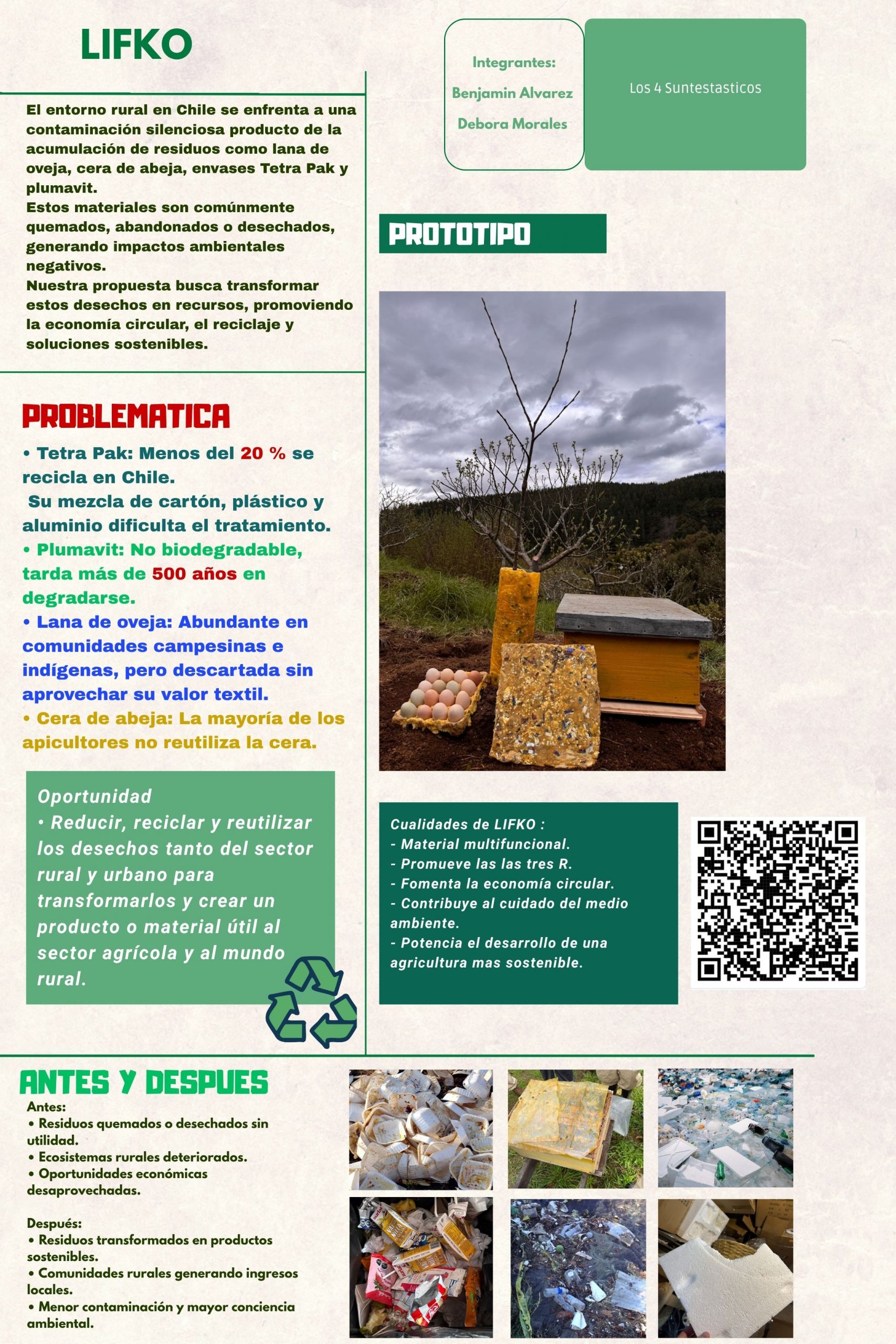 En nuestro contexto rural hemos detectado un problema creciente: la acumulación de residuos contaminantes, tanto provenientes de diversas prácticas y faenas agropecuarias como de materiales altamente perjudiciales que llegan al sector, como el plumavit, debido a la falta de conciencia ambiental. Entre estos residuos además del plumavit se encuentran la lana, Tetra Pak y cera de abeja. Los cuales no cuentan con un manejo adecuado y contribuyen significativamente a la contaminación del entorno rural.