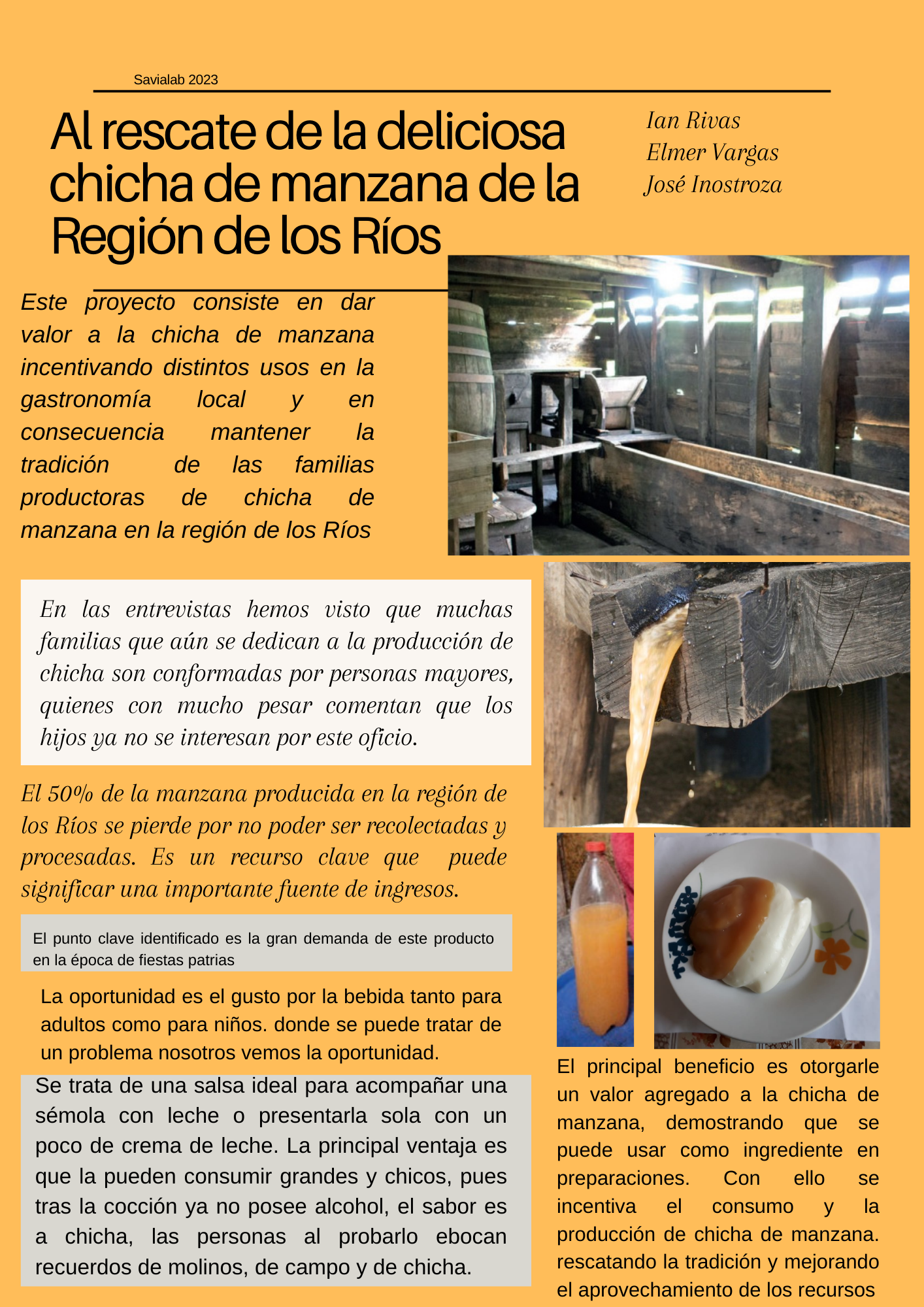 La idea es utilizar la chicha para preparaciones en postres y así dar valor agregado e incentivar la elaboración y consumo de este exquisito producto.