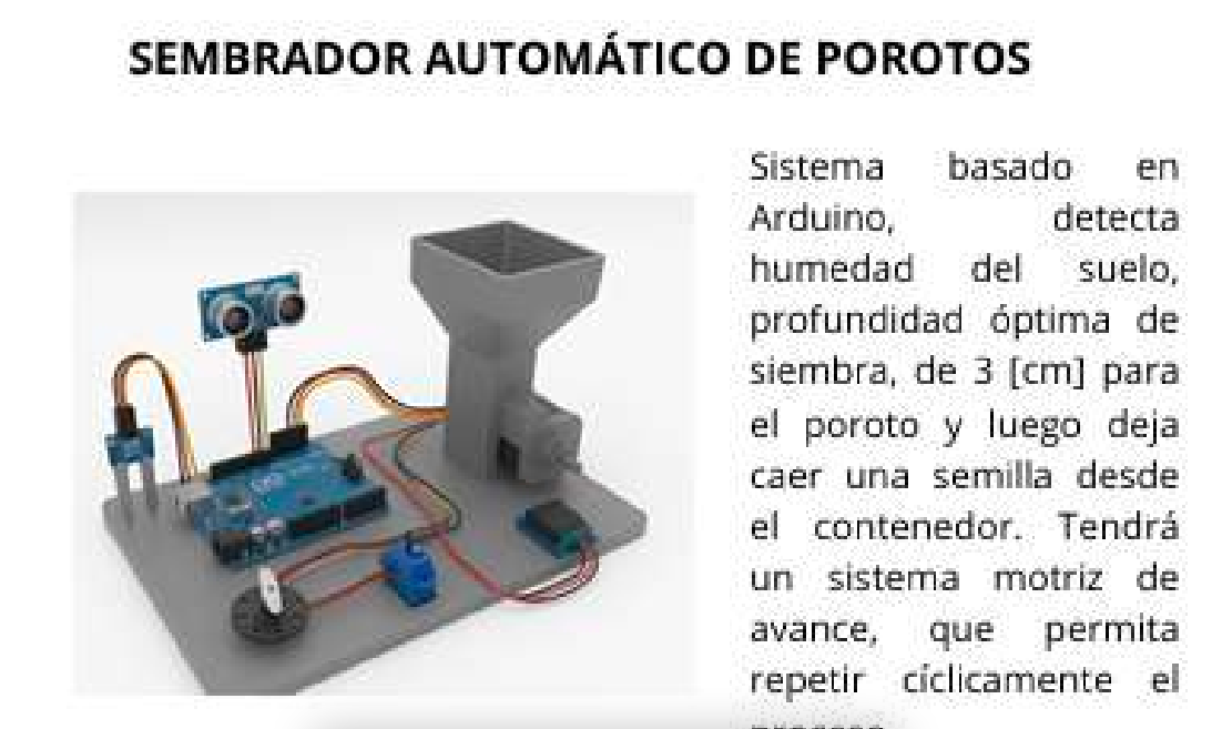 Sistema Arduino, basado en detectar la humedad del suelo, la profundidad óptima de siembra, de $3 \text{ cm}$ para el poroto, y luego deja caer una semilla desde el contenedor. Tendrá un sistema motriz de avance, que permita repetir cíclicamente el proceso.
