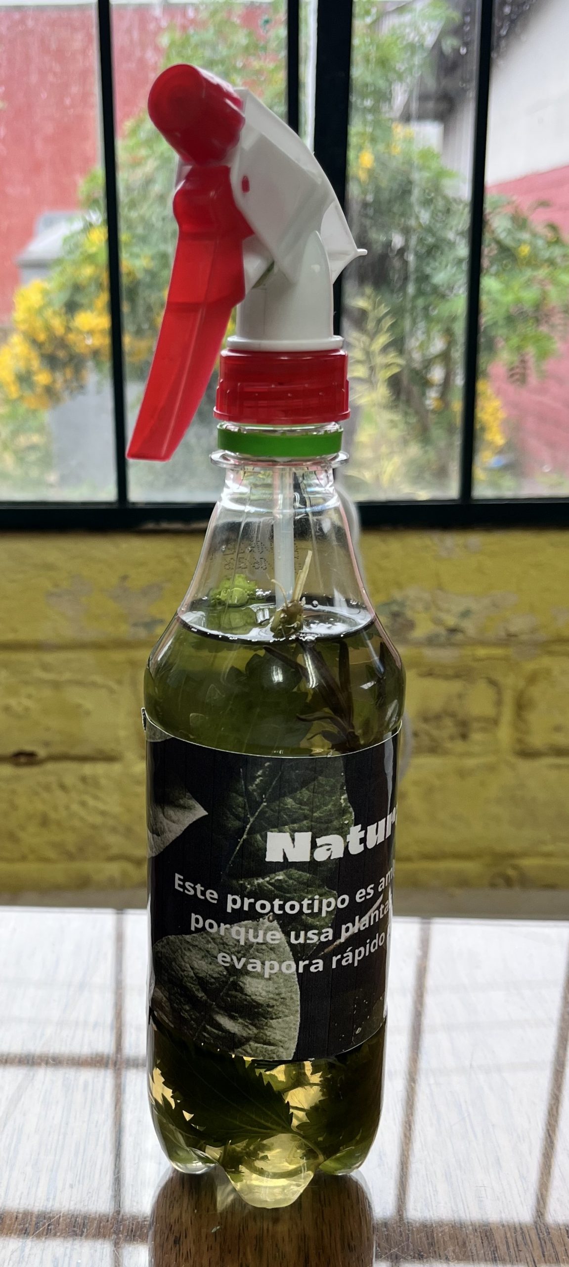 Hicimos un prototipo en una botella de $500\text{cc}$, con atomizador para más fácil uso, con etiqueta llamativa que informa sobre el producto. Se hizo: macerando las plantas durante $1$ semana para obtener los compuestos beneficiosos.