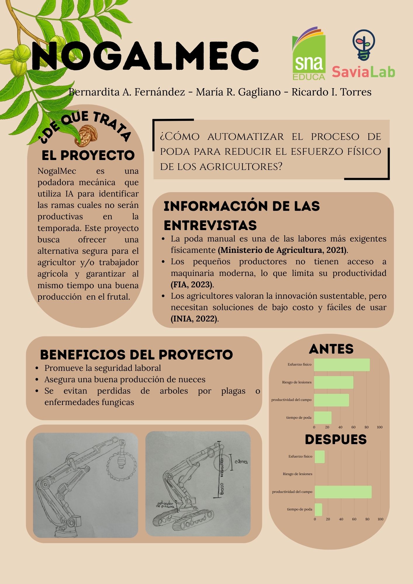 Nuestra idea de solución es automatizar el proceso de poda mediante un robot/máquina podadora controlada por una persona en conjunto con la IA, para reducir el esfuerzo de los trabajadores y de igual manera también los riesgos de posibles lesiones al realizar poda manual, lo que de igual manera sirve para la mejora de la producción del campo de nogales.