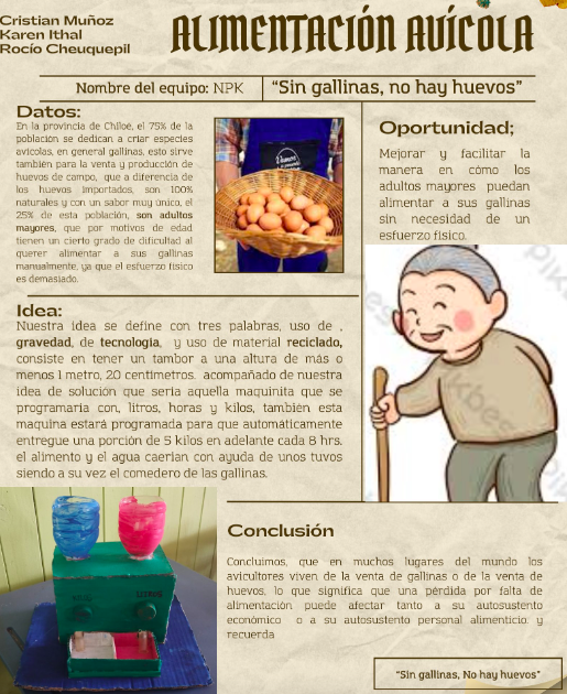 Nuestra idea consiste en crear una máquina que esté programada, con litros, hora, kilos, que funcione con ayuda de la gravedad, esta máquina tendrá una ayuda electrónica para el pase de alimento cada cierto tiempo. Tratamos de reciclar materiales tales como tubos de polietileno utilizados en las industrias acuícolas, en este caso serían las caídas al comedero, bidones de 200 Lts, como almacenador de alimento, en cierta altura (1 metro). Nosotros como equipo tratamos de ver en que podía afectar a la comunidad y sobre todo a los adultos mayores, vimos que hoy en día muchos adultos mayores tienen problemas físicos para poder llegar alimentar a sus aves, y en eso pensamos en cómo podríamos facilitar la alimentación sin necesidad que hicieran esfuerzo físico, también tratamos de que el comedero tenga una gran capacidad para alimentar, comederos que alcance alrededor de 120 gallinas aproximadamente, la caída se planea con la ayuda de una chapita que esté temporizada para dar el paso de caída al alimento, esta máquina debe de quedar cubierta, minimo las partes más delicadas como por ejemplo cableado y los comederos siempre tiene que recibir su debida limpieza y desinfección para evitar enfermedades en el criadero.