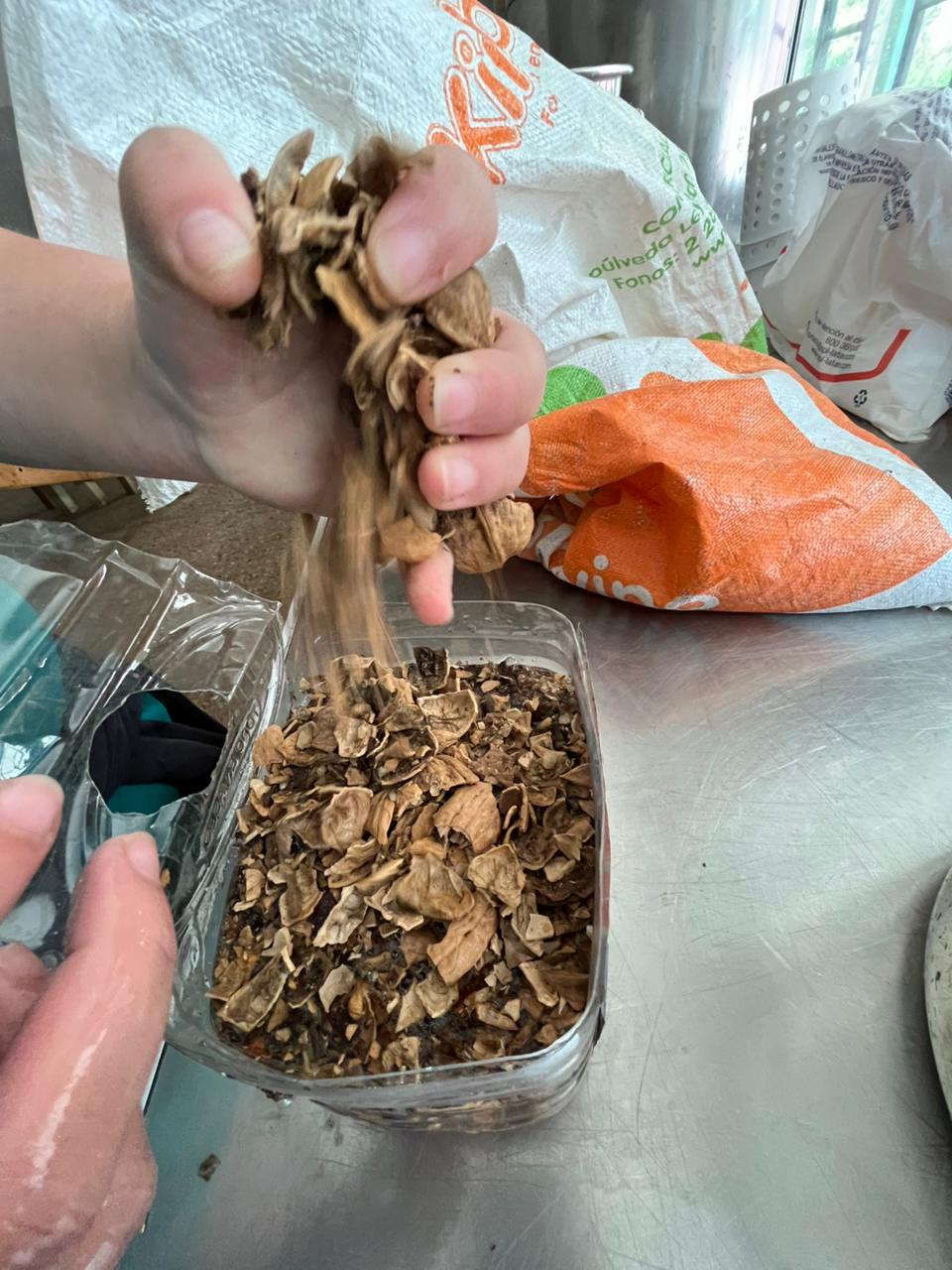 El testeo fue efectivo ya que salió como lo esperábamos, empezamos recolectando los nopales directo de nuestro liceo y este mismo lo pelamos y hervimos para mezclarlos con las cáscaras. Luego las pusimos en un hoyo para dejarlo reposando para que su consistencia pase de un gel con macro partículas de nuez a una tapadera sólida y orgánica.