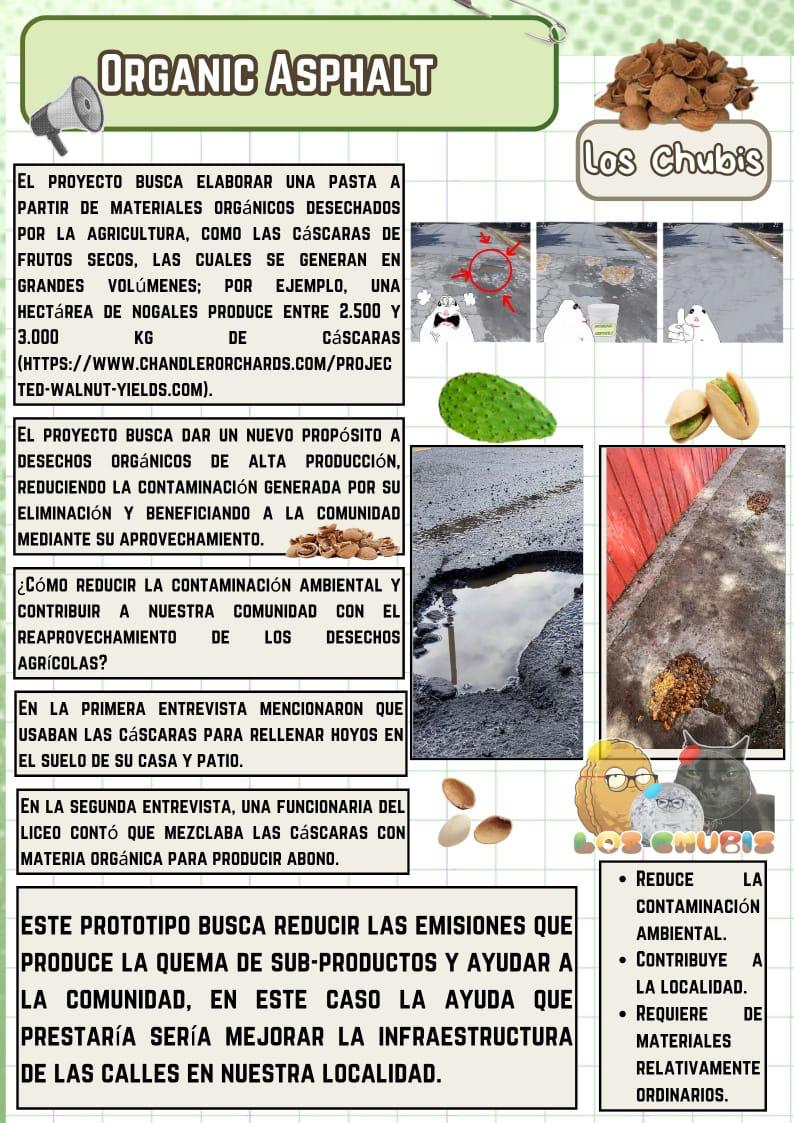 La solución planteada consiste en transformar residuos orgánicos agrícolas (principalmente cáscaras de nuez) en una pasta útil y sostenible, capaz de funcionar como un asfalto orgánico, otorgándoles un nuevo valor en lugar de desecharlos.