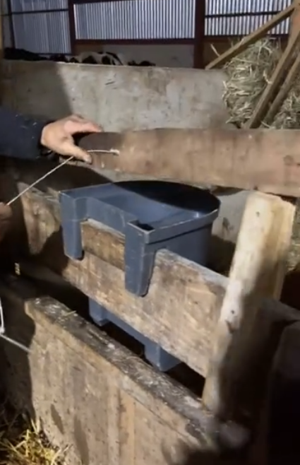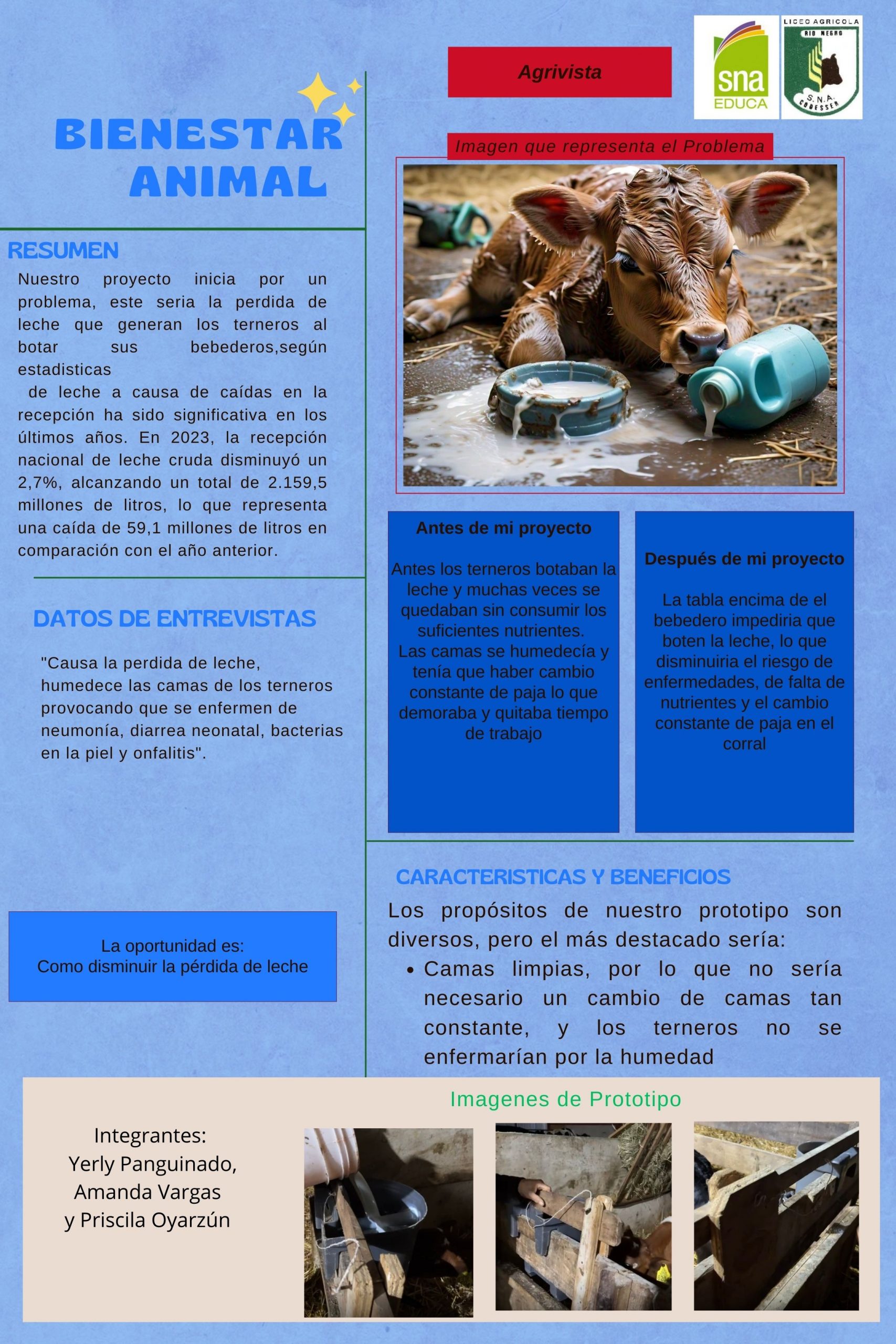 Nuestra oportunidad es un protector de bebedero en cual está hecho de madera con un par de clavos que le da seguridad a la tabla principal para que no se salga y pita para no perder el clavo se hizo el testeo y si cumple la función de que no se derrame la leche al beberla los terneros