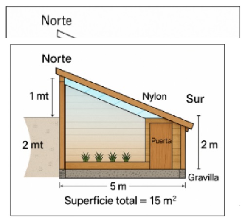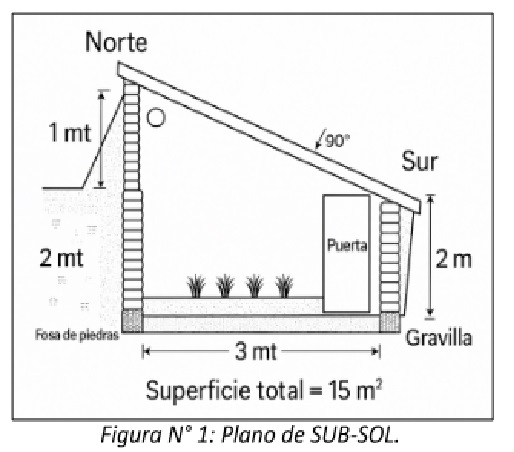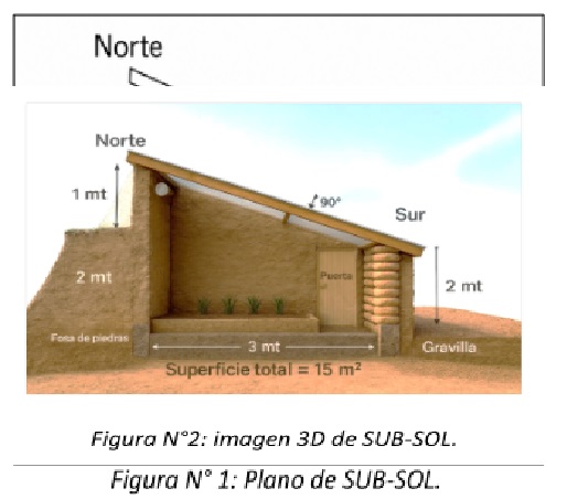El prototipo SUB-SOL es un invernadero subterráneo de $15 \text{ m}^2$ destinado al cultivo protegido de hortalizas. Sus dimensiones son $3 \text{ m}$ de frente (Oeste–Este) por $5 \text{ m}$ de largo y $2 \text{ m}$ de profundidad.