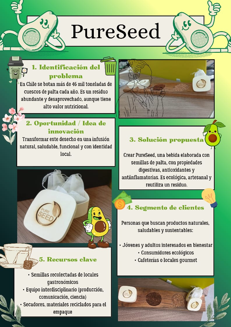 Elegimos el cuesco de la palta ya que la palta en sí es un fruto que se consume a lo largo de todo el país durante todo el año, y siendo algo tan común como la palta el desperdicio que es el cuesco no se toma en cuenta. Nosotros buscamos darle una segunda vida a este desecho. Así nace PureSeed: una infusión natural elaborada a partir de semillas de palta, con propiedades digestivas, antioxidantes y antiinflamatorias, validadas científicamente. Es un producto saludable, ecológico y con diseño artesanal, con envases de madera, sin uso de plásticos contaminantes.