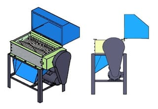 RTR es una máquina para triturar llantas que posee una banda eléctrica que transporta el caucho hacia sacos, para almacenarlo.