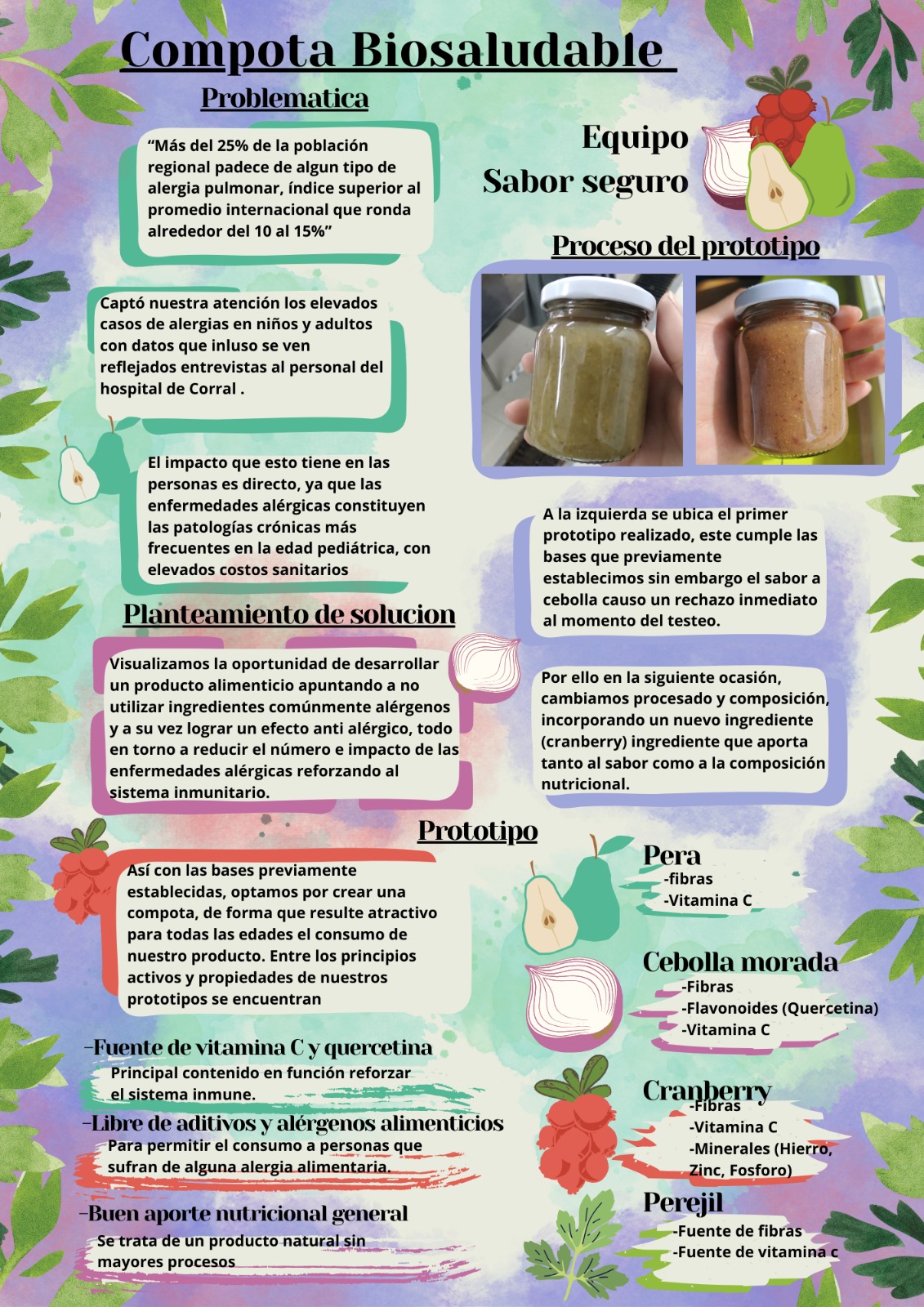 Elaboración de una compota con un alto valor en vitamina c, utilizando ingredientes hortofrutícolas y libre de aditivos para así fortalecer el sistema inmune y a su vez que se destaquen sus propiedades nutricionales. Los principales ingredientes de nuestra compota son: pera, cebolla, perejil y berries, materias primas que a través del proceso productivo se transformaron en una pulpa que posteriormente se envasó en frasco de vidrio y se pasteurizó. El proceso se realizó con el sentido de no aplicar tratamientos térmicos que pudieran alterar las