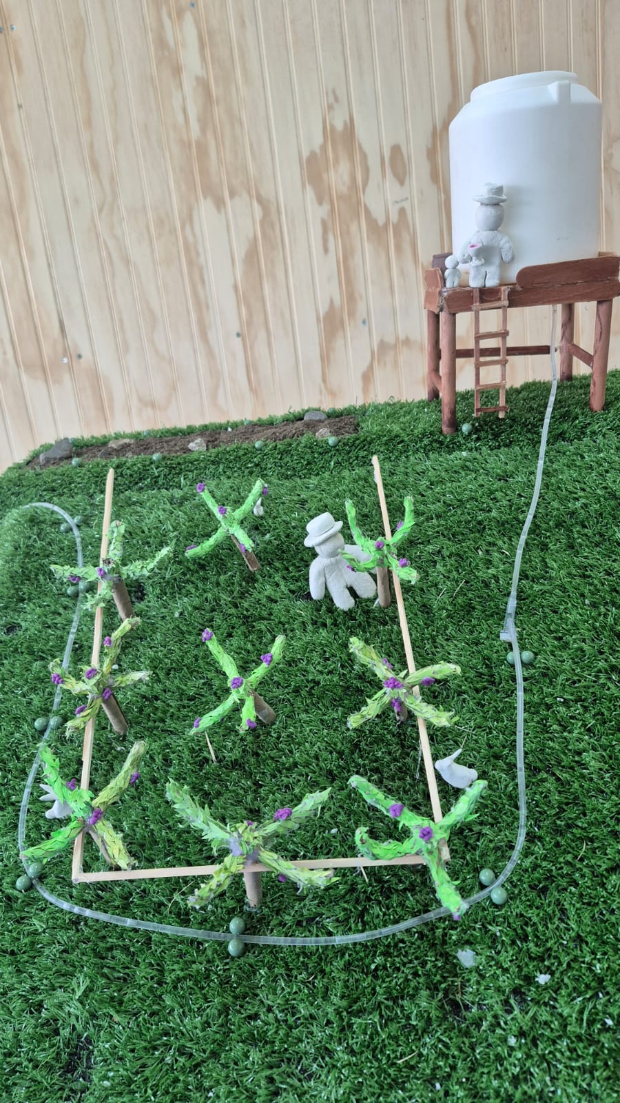 Para probar nuestra idea, construimos un prototipo a escala como podría implementarse en una viña real, simulamos varias pruebas con el fin de comprobar si el sistema podía repeler plagas, regular el riego de forma eficiente y distribución de las hileras con los aspersores, aromas y el tanque; es decir, queríamos comprobar primero el funcionamiento básico del sistema de riego y dispersión de los aromas naturales.