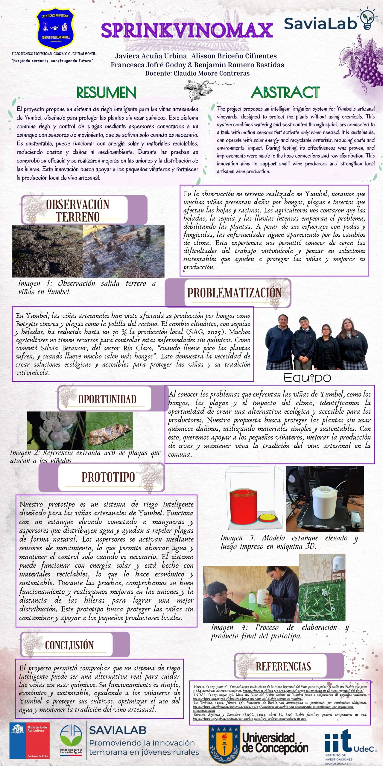 En las viñas artesanales de Yumbel existen muchos problemas causados por hongos como Botrytis cinerea y Eutypa lata, además de aves, ratones y pequeños insectos que dañan las hojas y los racimos de uva, provocando pérdidas en la producción y afecta la calidad del vino artesanal, que es parte importante de la identidad local de Yumbel. Queremos mejorar el manejo de control este sistema está diseñado para las viñas artesanales de Yumbel y funciona mediante una red de tubos conectados a un estanque elevado que distribuye agua mezclada con aromas naturales. Los regadores están dispuestos estratégicamente en el terreno entre las hileras de las plantas y el estanque elevado que permite mantener la presión del agua en forma constante. Cada regador incluye aspersores con sensores de movimiento (PIR) que se activan automáticamente cuando detectan la presencia de insectos o animales liberando el aroma repelente solo cuando es necesario y evitando la contaminación química del suelo. Además, esta idea es modelada el tanque de forma digital donde se piensa el depósito con tapa desmontable. Esto puede funcionar ya que puede funcionar con energía solar que requiere mantenimiento mínimo y utiliza materiales reciclables fáciles de conseguir; ya que podría estar bordeando entre los $45 mil pesos si el regador se abre a mano en horarios fijos (bidón, manguera, microaspersores, filtro de línea básico, estacas, recipientes para mezcla aromática) hasta $250 mil pesos siendo semiautomática y solar.