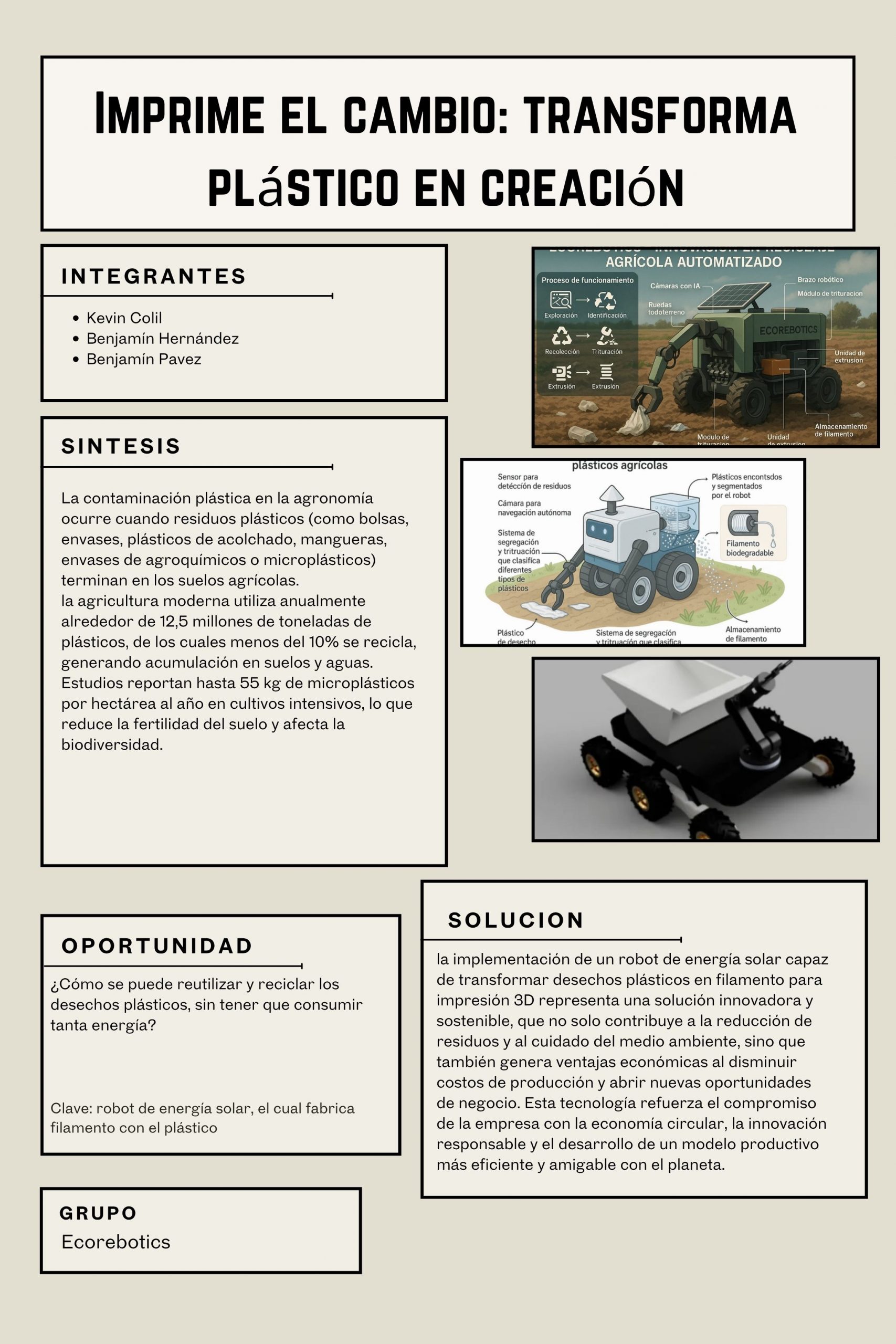 Así creamos Ecorebotics, un robot solar portátil que recolecta, limpia y transforma los residuos plásticos agrícolas en filamento biodegradable para impresión $3\text{D}$, permitiendo fabricar herramientas y piezas localmente.