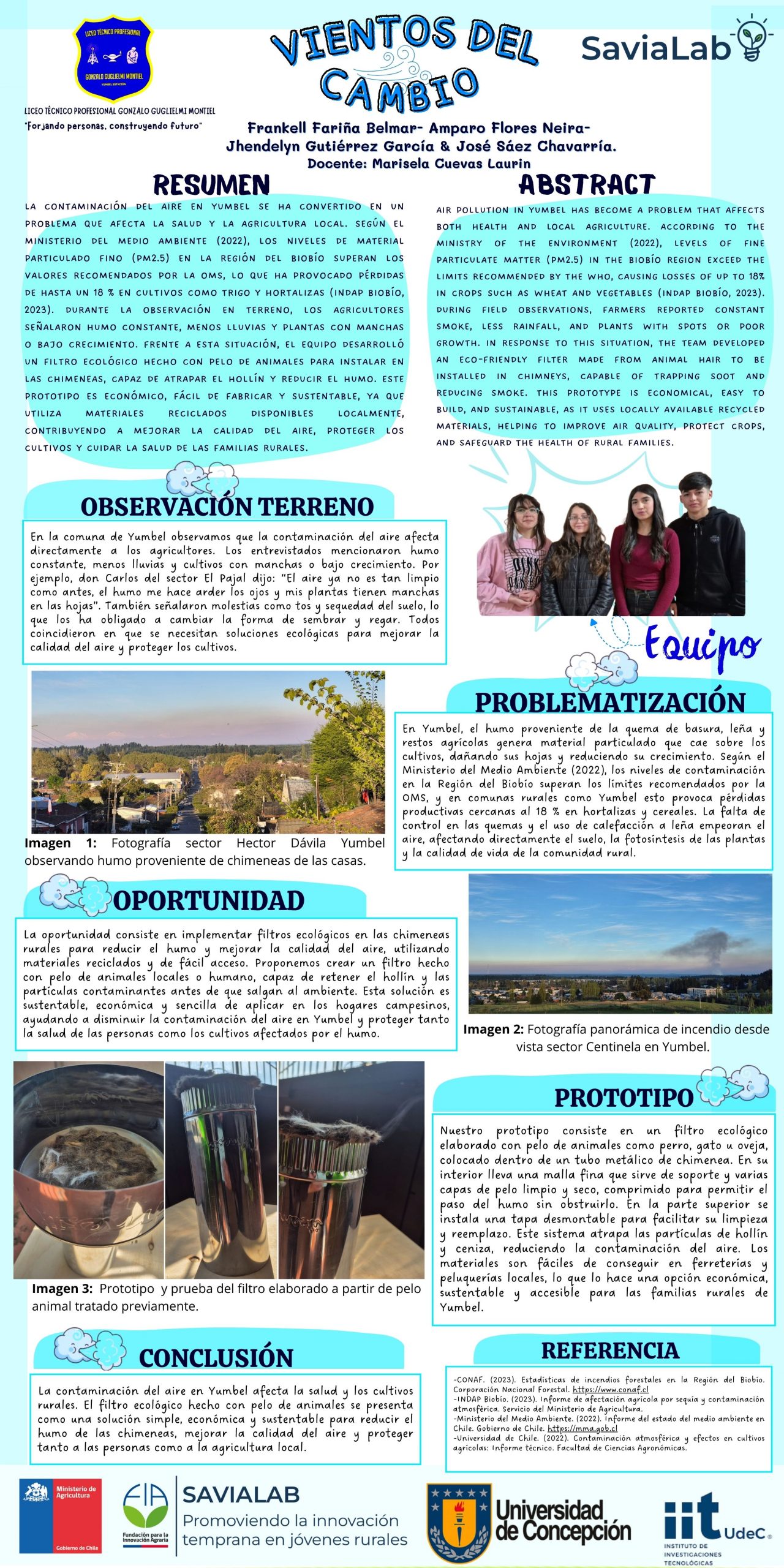 Consiste en implementar un filtro ecológico hecho con pelo de animales locales como perro, gato, oveja o humana para colocar en las chimeneas y así ayudar en el aire de las zonas rurales y urbanas producto de los incendios forestales o quemas alrededor. Con este filtro buscamos que este al alcance de cualquier familia campesina como alternativa simple, económica y sustentable porque los materiales a utilizar son muy fáciles de conseguir y adaptar.